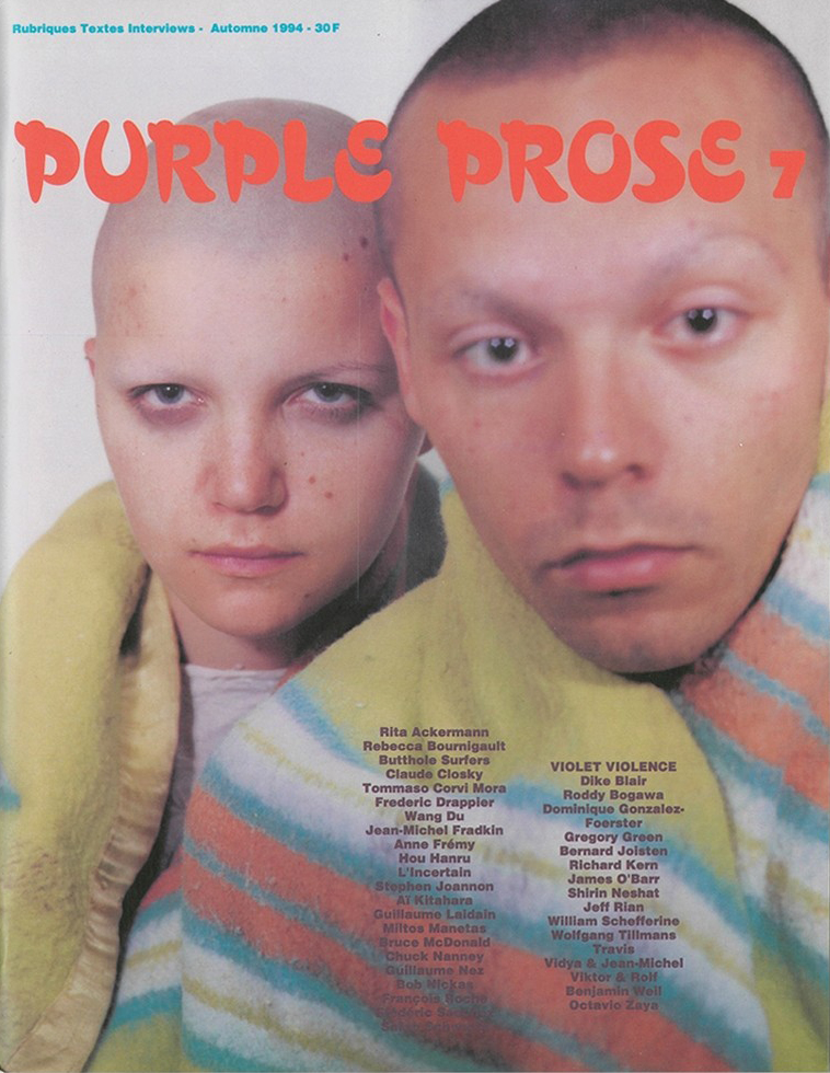 “We launched Purple Prose in the early 1990s without any means, and without any experience, because we wanted to make a magazine that was radically different. We wanted to support the artists around us that no one else supported, much less talked about. [..] It would be a form of opposition of our own, different from the critical jargon of the generation of ‘68. [..] From a visual standpoint, we represented the break from ’80s imagery (like Richard Avedon’s photography for Versace, for example). From an artistic standpoint, the artists of the early ’90s were rising up against art as capital fetish [..]. In saying that Purple is the portrait of a generation, I mean it’s a portrait of those who embody their times. At the same time, it’s a portrait of myself and Elein Fleiss, our ideas, our lives, and our aesthetics.” - Zahm, Olivier and Fleiss, Elein (Purple Anthology, Art Prose Fashion Music Architecture Sex, Rizzoli 2008)