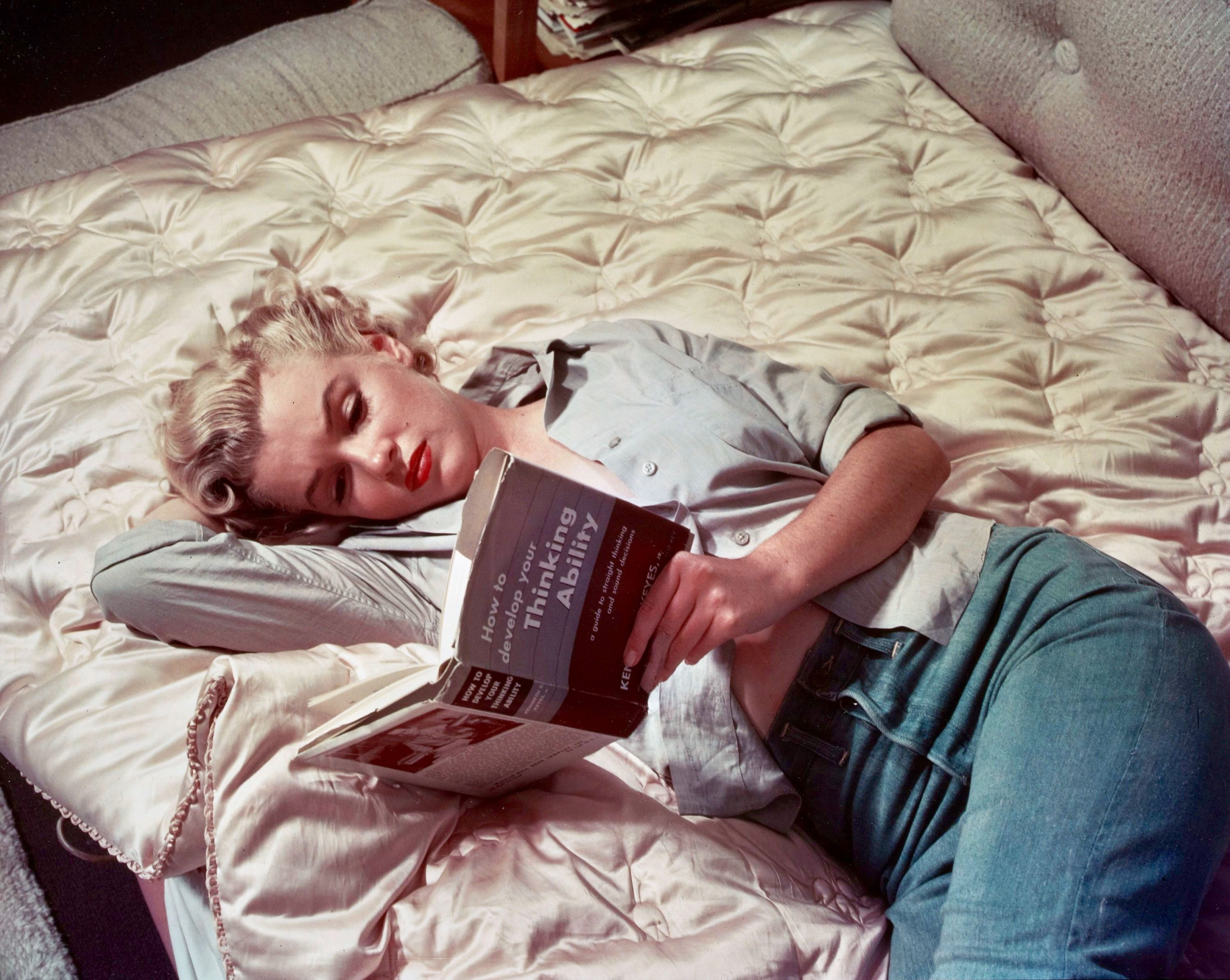 Marilyn Monroe reclines on an uncovered white duvet in what seems to be her own living room. One arm is bent behind her head, propping it forward. Her left hand holds a book, its title clearly legible: ‘How to develop your thinking ability’. Her brow is slightly furrowed, her folded legs tilting crossed out of shot. Her body lies idle, but her mind - and her image - are at work, concentrated, perhaps even slightly frustrated, by what she is reading. The scene is set: we see Monroe reading, although we cannot see what she is reading; in any case, she is being staged to look like she is reading so deeply she appears as if unaware of the camera’s presence. The book-as-prop becomes a double supplement. On one hand, it excessively absorbs her attention, suggesting that Monroe must “develop the ability to think”; on the other hand, it supplements the fact that such a development is not already tangibly and satisfactorily conveyed. We all already knew that Monroe was an avid reader, so this excessive reiteration threatens to render actuality itself strangely uncertain. Intended for a fashion publication - although John Florea’s photograph was not published at the time - its present hyperdissemination across such culture-oriented social media as Tumblr and Pinterest testify to its abiding success.